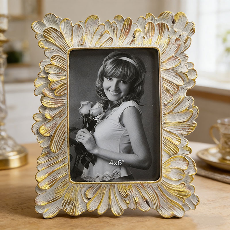 Deze fotolijst is een handgemaakt kunstwerk van hars in een Europese vintage stijl.Het heeft een randvorm die bestaat uit gelaagde en uitgespreide bloemblaadjes. Door de combinatie van een verouderde witte achtergrond en goudverftechnieken krijgt het een lichte en luxueuze retro-uitstraling. Het is geschikt voor foto's van 4x6 inch en kan als decoratie op een bureau of kaptafel worden geplaatst. Het kan ook worden gebruikt als een prachtig cadeau voor bruiloften, verhuizingen of jubilea, en voegt een romantische, feestelijke sfeer toe aan het leven.