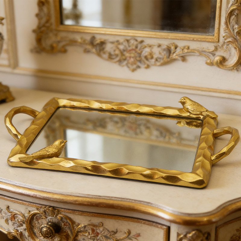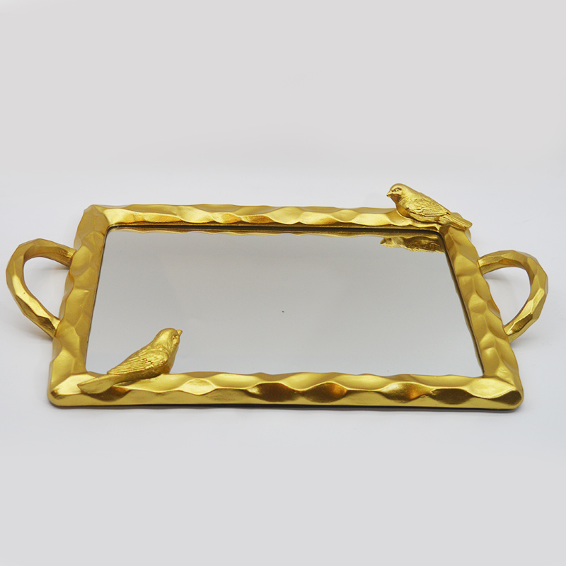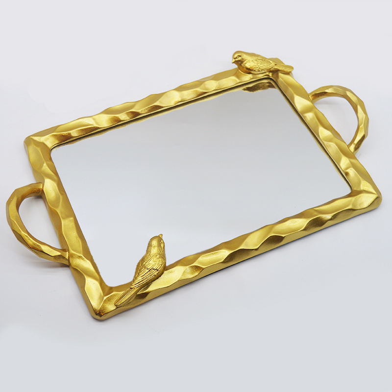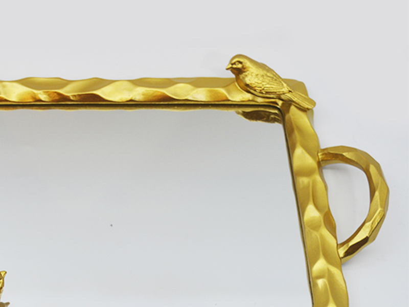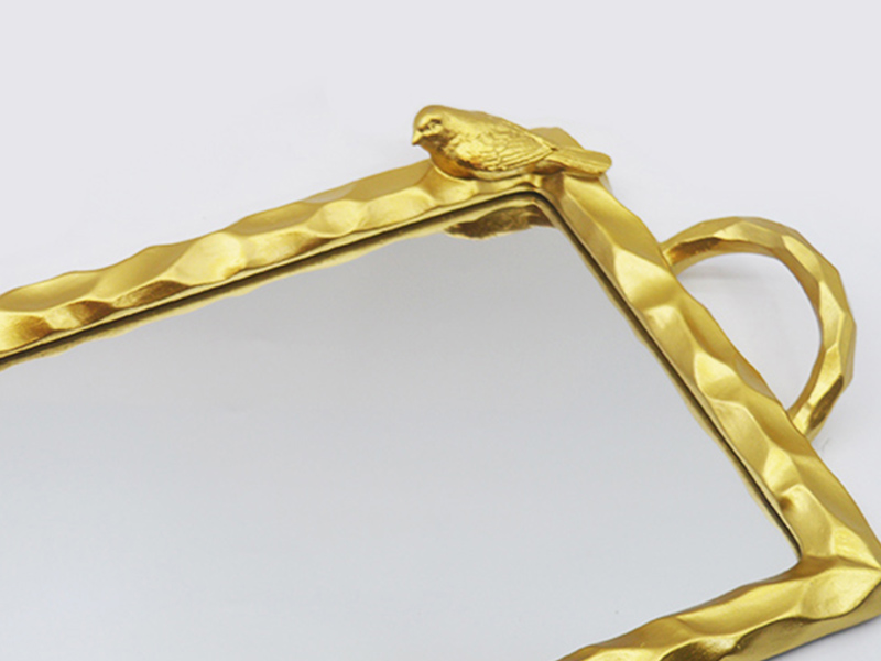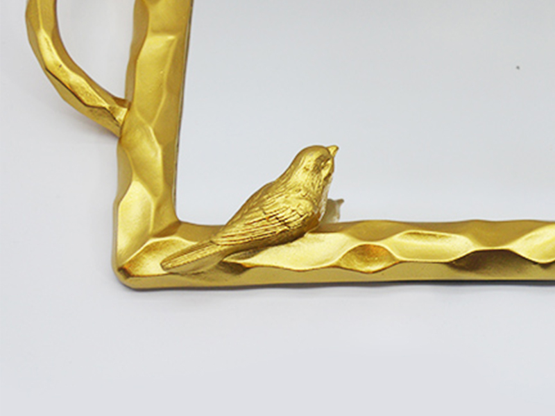 Dit kleine vogelvormige dienblad van hars is gemaakt van hoogwaardig hars als basismateriaal.Het oppervlak is verguld. Het frame heeft een hamerslagstructuur en is versierd met een driedimensionaal vogelreliëf. Het is zowel levendig als verfijnd. De binnenkant van het dienblad is voorzien van een spiegelend oppervlak met hoge resolutie, wat een reflecterend decoratief effect combineert met praktische opbergruimte. Het ontwerp met dubbele handgreep maakt het vasthouden gemakkelijker. Of het nu gebruikt wordt voor het opbergen van sleutels en sieraden in de hal, het plaatsen van make-up op de kaptafel of het tentoonstellen van geurende theeserviezen op de salontafel in de woonkamer, het biedt opbergruimte en voegt tegelijkertijd een artistieke sfeer toe aan een retro-interieur.