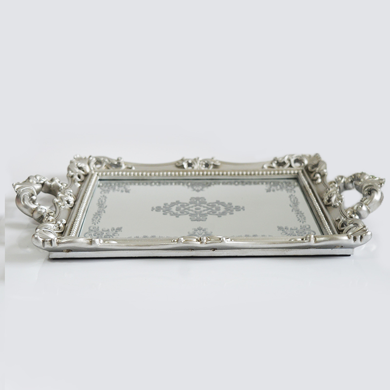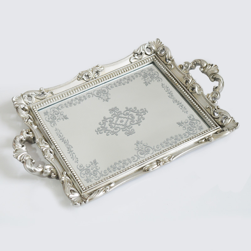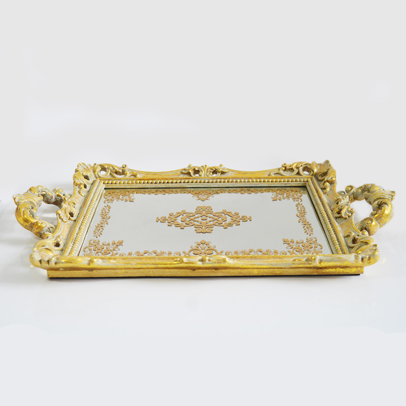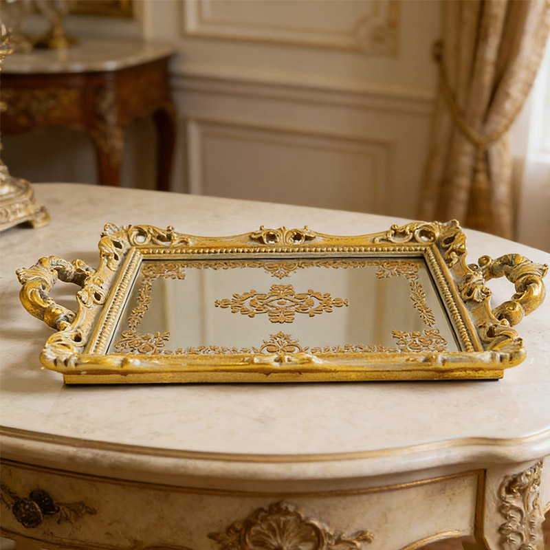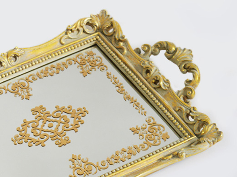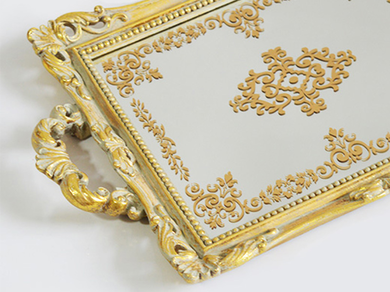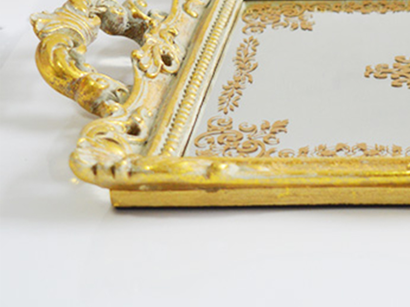 Het hoofdframe is gemaakt van epoxyhars:Gemaakt van polyesterhars, een hard en licht materiaal. Het oppervlak is afgewerkt met verguldsel/goudfolie en een verouderingsbehandeling, wat een retro, imperiaal gouden textuur creëert. De binnenkant van het dienblad bestaat uit 3 mm dik spiegelglas met gepolijste en afgeronde randen. Het is veilig en krasbestendig.