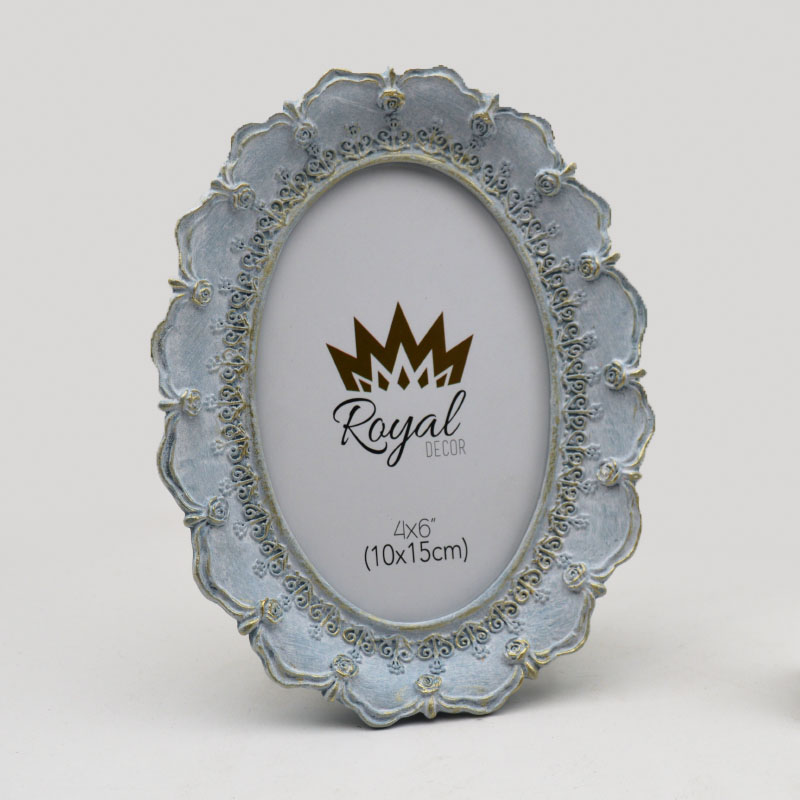 Wij bieden hoogwaardige fotolijsten van polyhars Met een vintage barok design. Dit model 1789 heeft een handgeschilderde antieke blauw-gouden afwerking en is geschikt voor woondecoratiewinkels, cadeauwinkels en leveranciers van bruiloftsbenodigdheden. Het product combineert een duurzame harsconstructie met een front van echt glas, wat zorgt voor een hoge waargenomen waarde voor uw klanten.