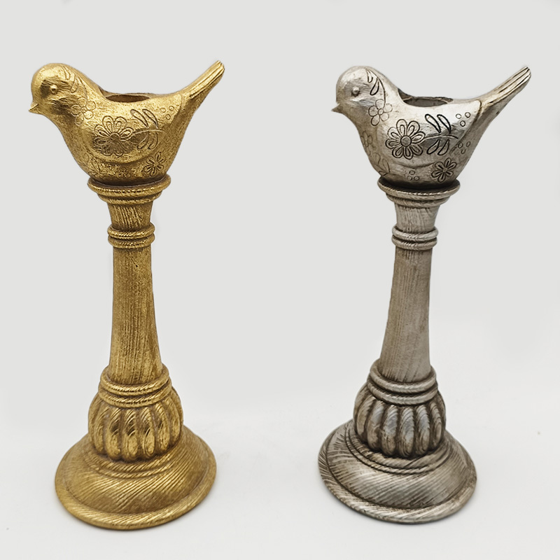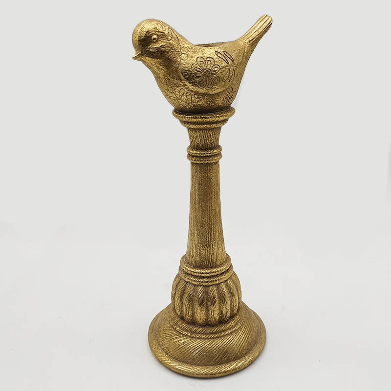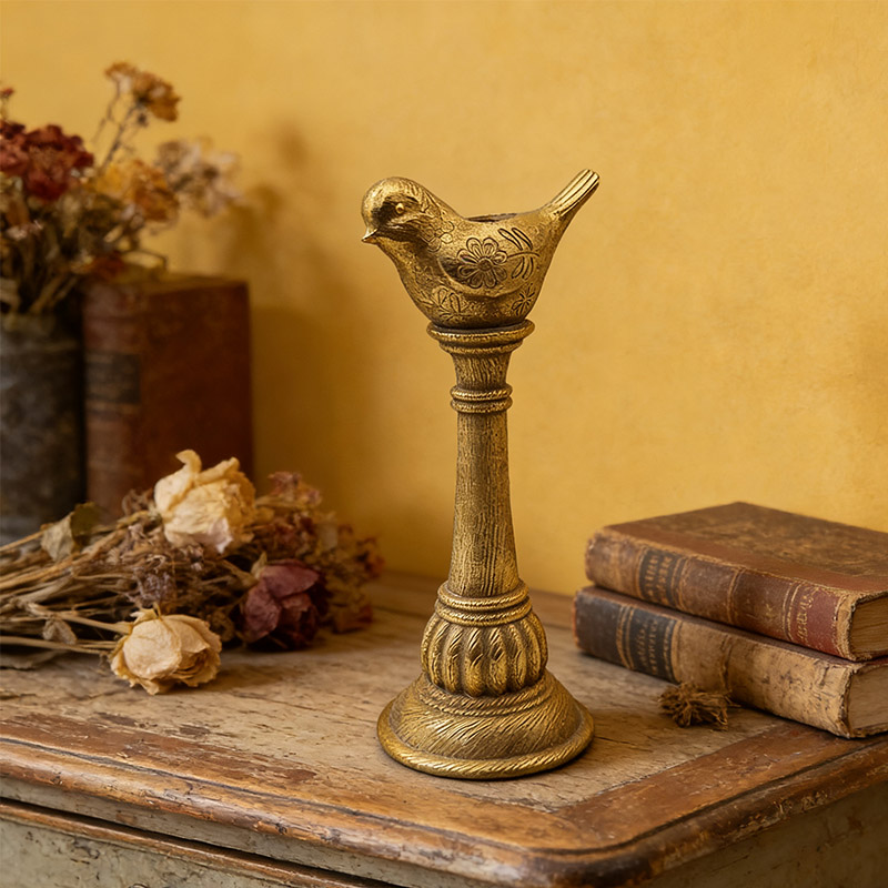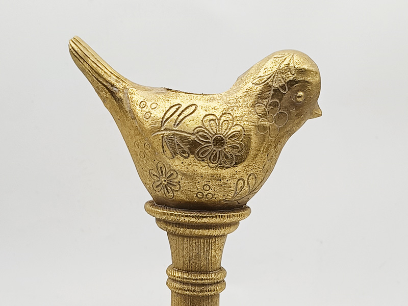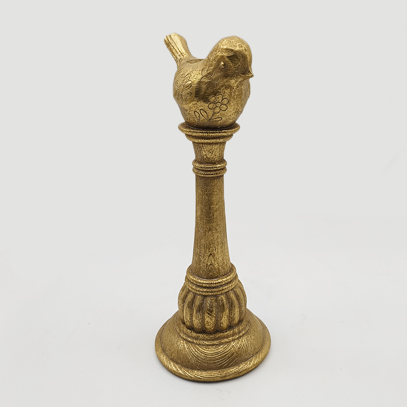 Hoofdontwerp: De bovenkant van de kandelaar is voorzien van een driedimensionale vogelvorm. Het vogellichaam is rond en gestroomlijnd, met een licht gekantelde kop, een kleine snavel en een omhoog gebogen staart, wat de vogel een levendige uitstraling geeft. Onder de vogel bevindt zich een klassieke kolomvormige steun. De kolom is gelaagd vormgegeven, met een recht gedeelte in het midden en een lotusvormige basis met bloembladachtige gravures aan de onderkant. De algehele lijnen zijn elegant en passen bij de decoratieve stijl van de Amerikaanse retrostijl.