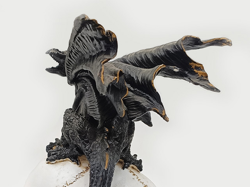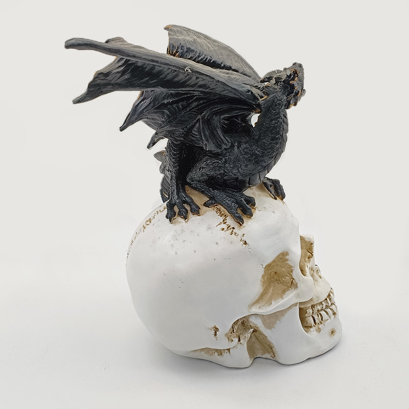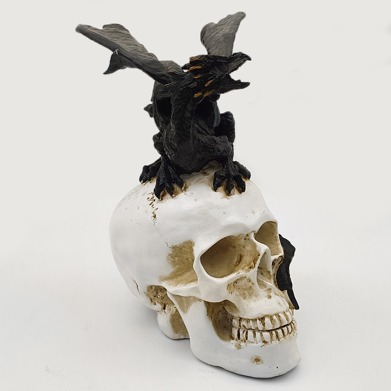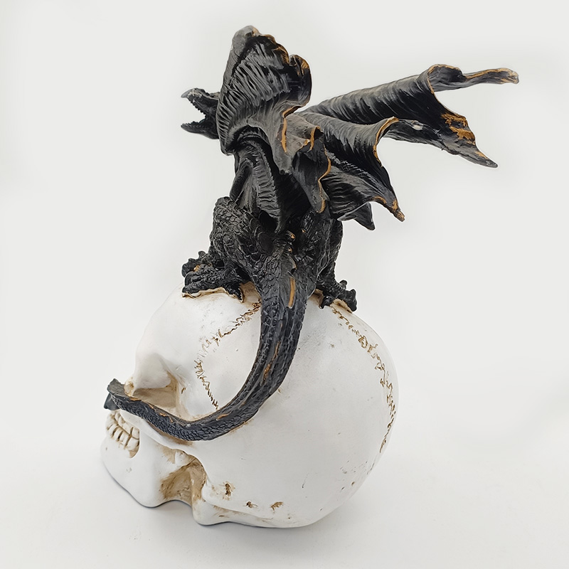 Algemene afwerking: De overgang tussen de schedel en de zwarte draak is natuurlijk. Het harsmateriaal heeft een dikke textuur en een sterk kleurcontrast (witte schedel + zwarte draak), waardoor een mysterieuze en krachtige fantasie-sfeer ontstaat.