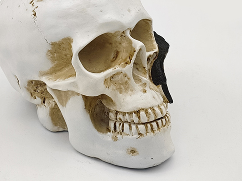 De oogkassen, neusholte, tanden en andere botstructuren op de schedel zijn duidelijk weergegeven, waarbij de contouren de verhoudingen van een echte menselijke schedel nauwkeurig weergeven. De textuur is fijn en heeft een natuurlijke matte afwerking.