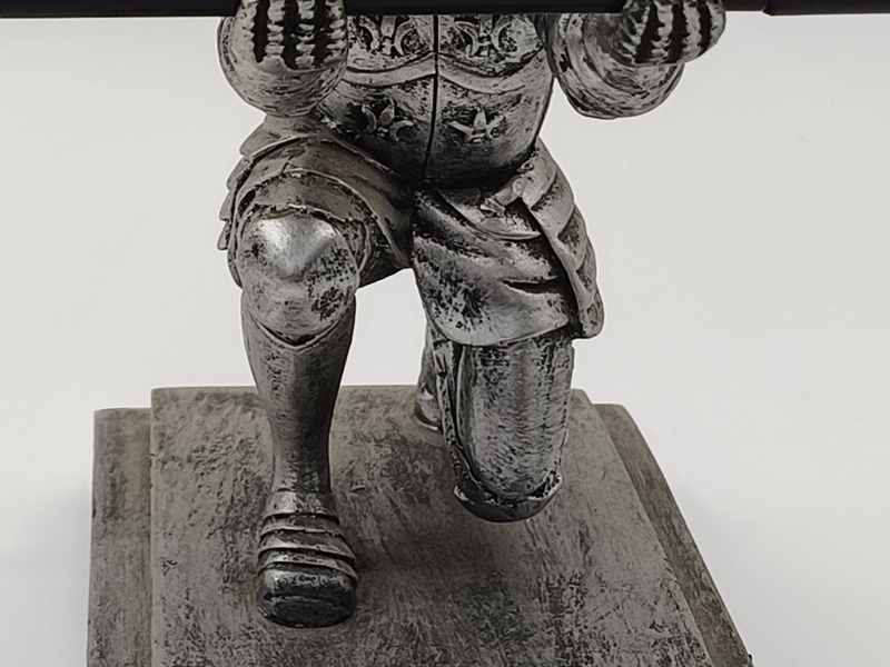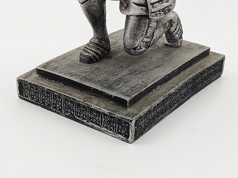 De voet van het decoratieve object is vierkant van vorm, met retro patronen gegraveerd op de randen, die de klassieke stijl van het hoofdgedeelte van de ridder weerspiegelen. De zware voet zorgt voor stabiliteit tijdens het plaatsen. De matte zilverkleurige metallic textuur in combinatie met het eenvoudige ontwerp zorgt voor een perfecte harmonie met de Europese klassieke esthetiek en past ook goed bij moderne woonstijlen zoals lichte luxe en retro.