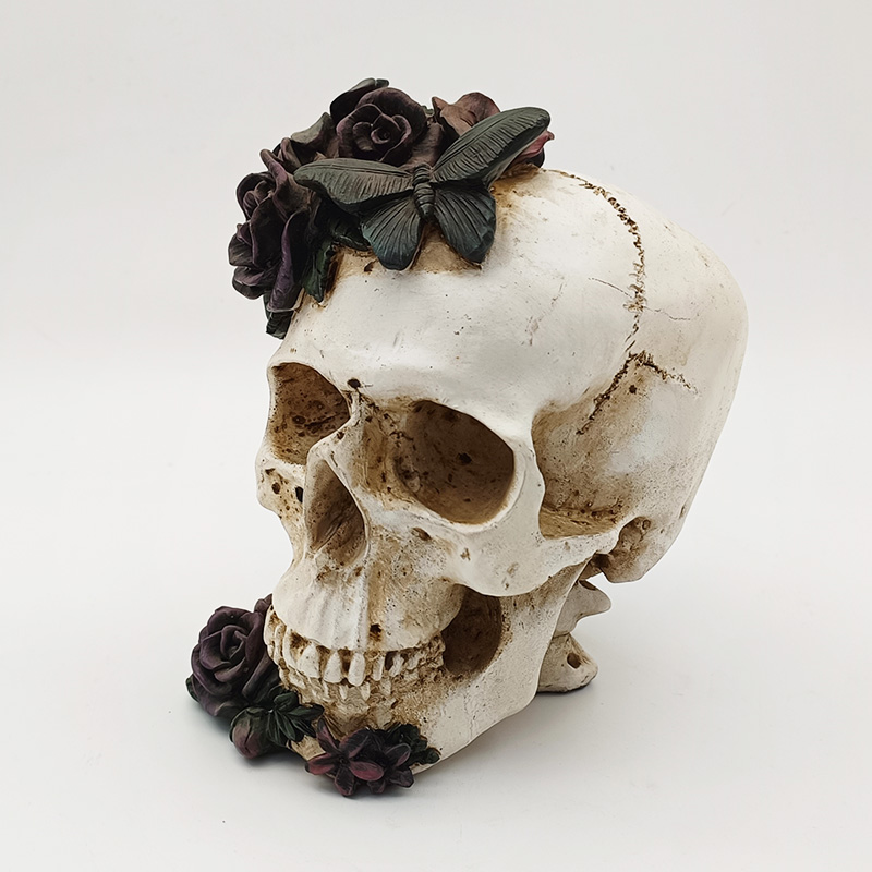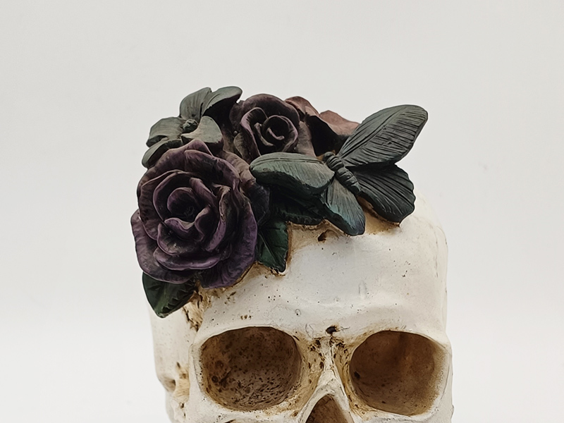 Basiskleuring: Het grootste deel van het skelet is bedekt met 2-3 dunne lagen matte witte verf. Na het drogen wordt het verouderd en gekleurd met donkere pigmenten om de textuur van de botgroeven te accentueren; de rozen zijn in lagen geschilderd (donkerpaarse basiskleur + donkerroze kleurovergang), de bladeren zijn donkergroen geschilderd en de vlinder is uitgevoerd in zwart-wit of donkerpaars contrast, allemaal met fijne lijnen om de gedetailleerde patronen te omlijnen.