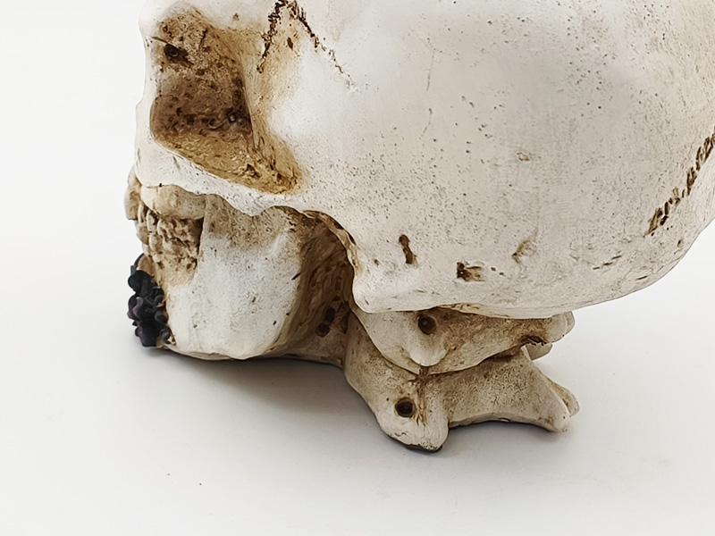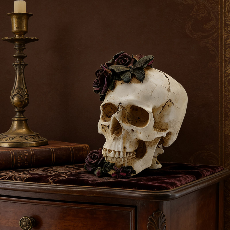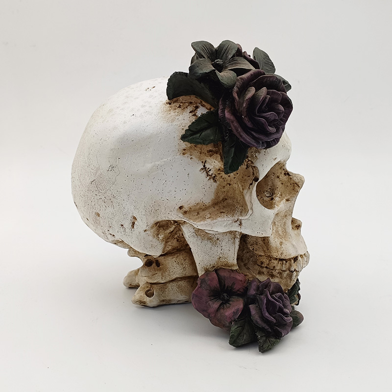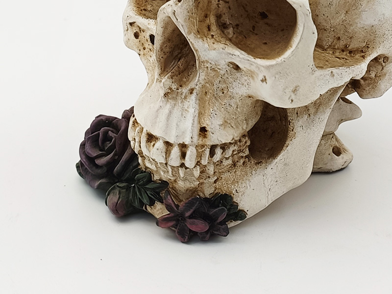 Bloemen en versieringen: Bovenop de schedel en bij de onderkaak bevinden zich driedimensionale dieppaarse rozen. De bloemblaadjes zijn duidelijk gelaagd en hebben een fijne textuur, die overgaat van dieppaars naar donkerroze. De textuur is zeer realistisch. Naast de rozen,