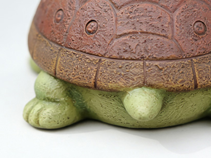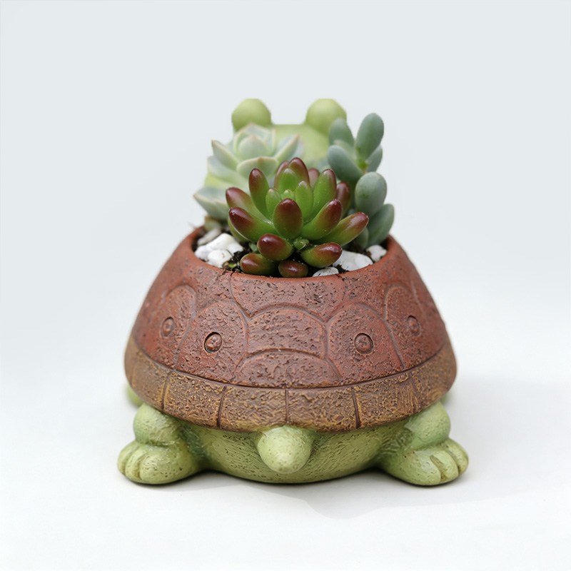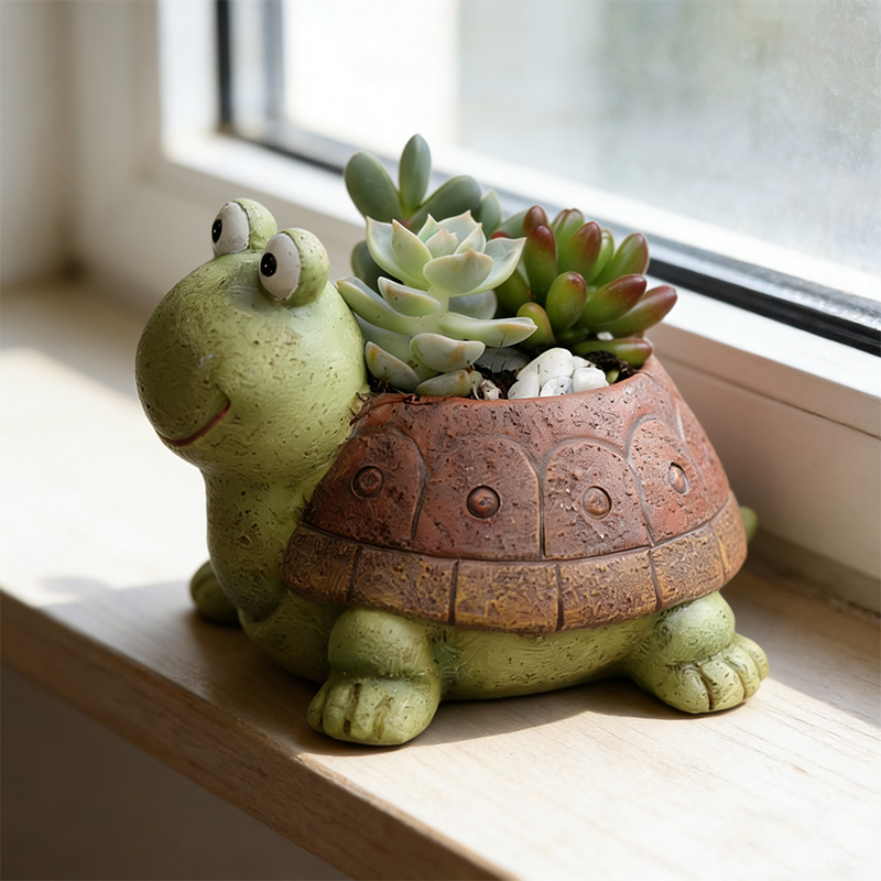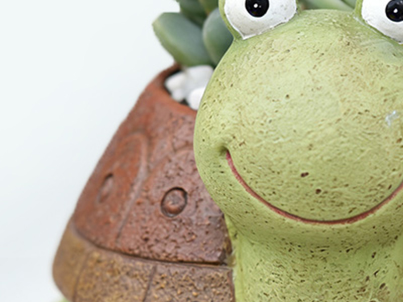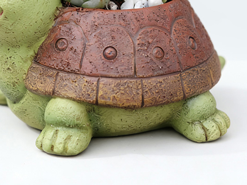 Vorm en structuur:Het algehele ontwerp is een driedimensionale cartoonachtige schildpadvorm. Het schild is hol vanbinnen met gleufjes voor bloemen, waarin kleine vetplanten en andere groene plantjes kunnen groeien. De poten van de schildpad liggen plat, de kop is iets omhoog gericht, de lichaamsverhoudingen zijn harmonieus, de lijnen zijn rond en schattig, en het ontwerp combineert functionaliteit met decoratieve waarde.