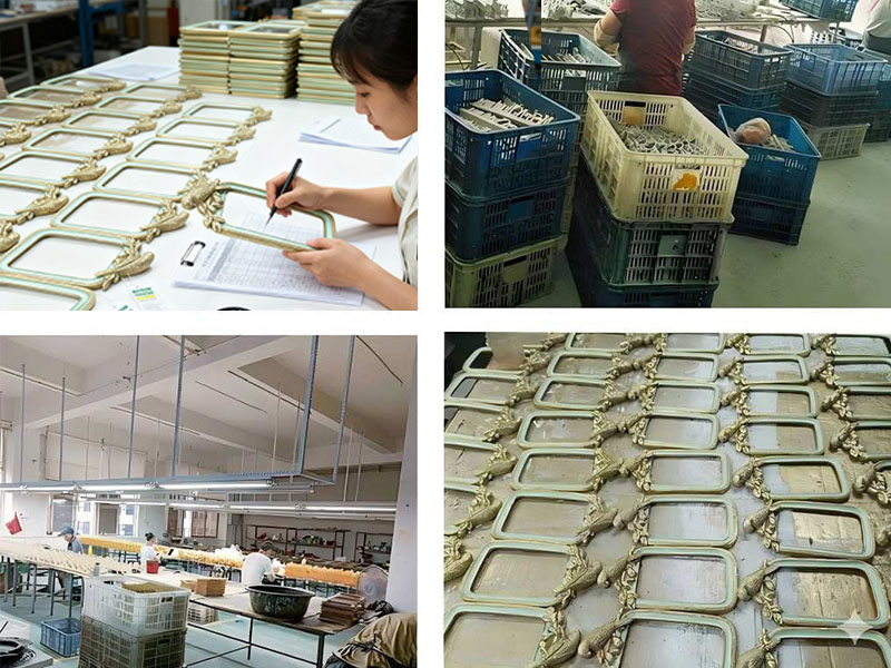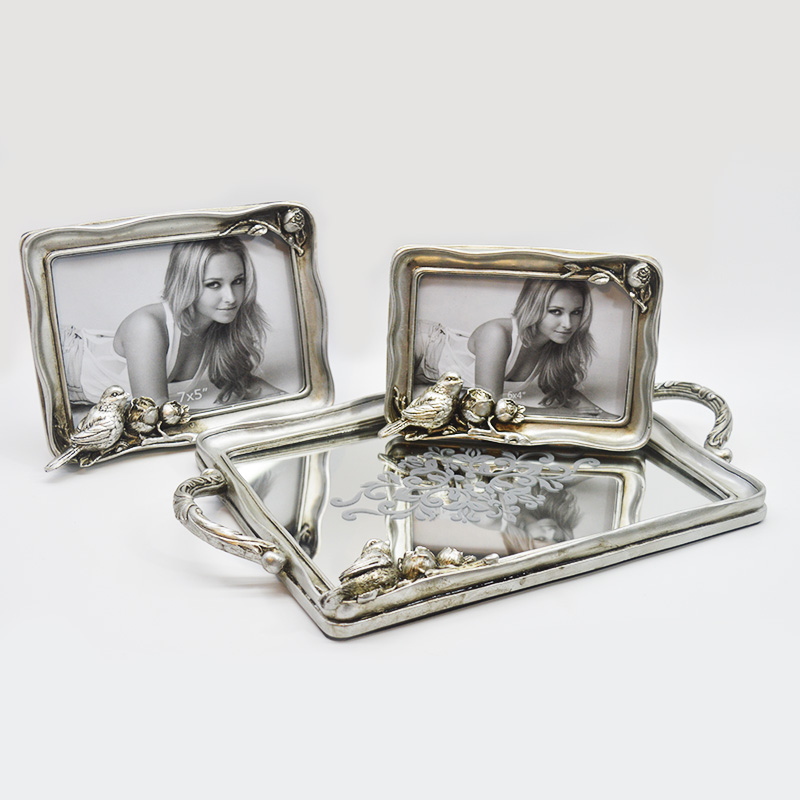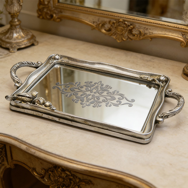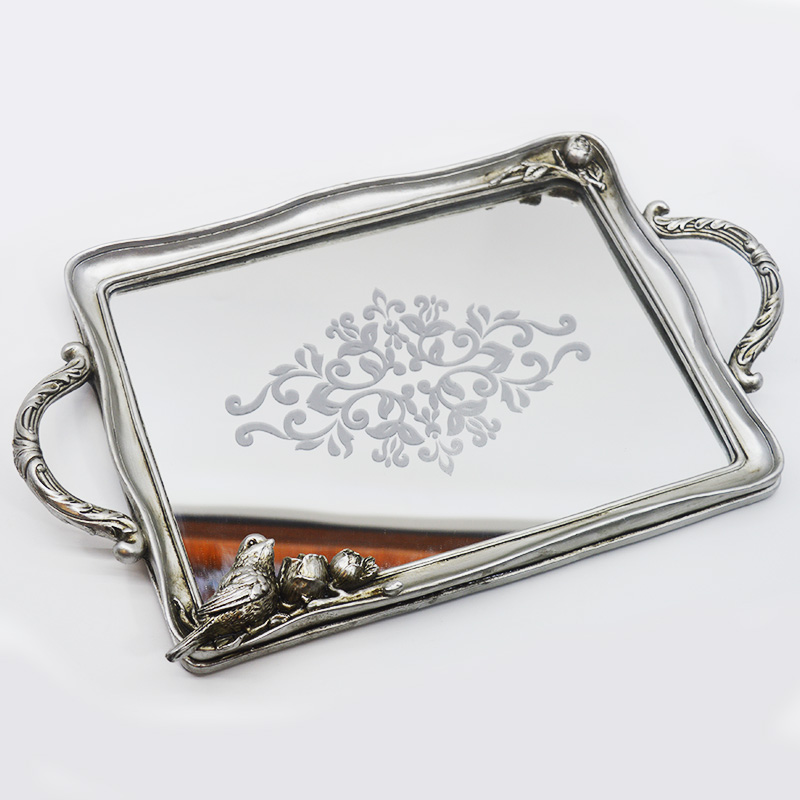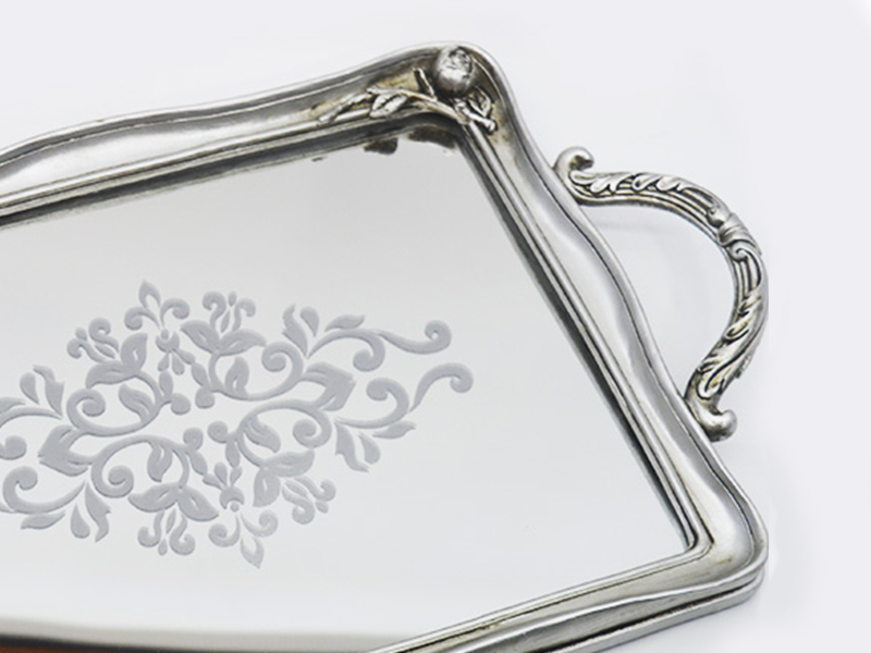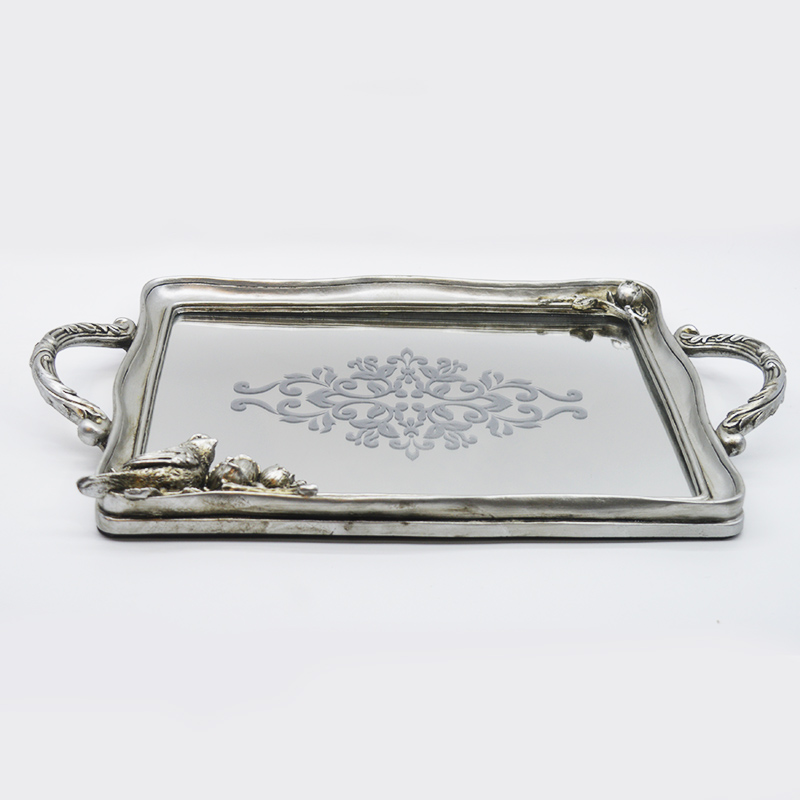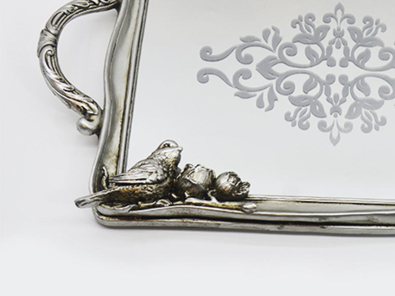 Het hoofdframe is gemaakt van hars, met een retro-verouderde zilveren coating op het oppervlak, wat een matte metallic textuur oplevert; de binnenkern van het dienblad bestaat uit 3 mm dik, hoogwaardig spiegelglas, dat zowel decoratieve als praktische eigenschappen combineert.